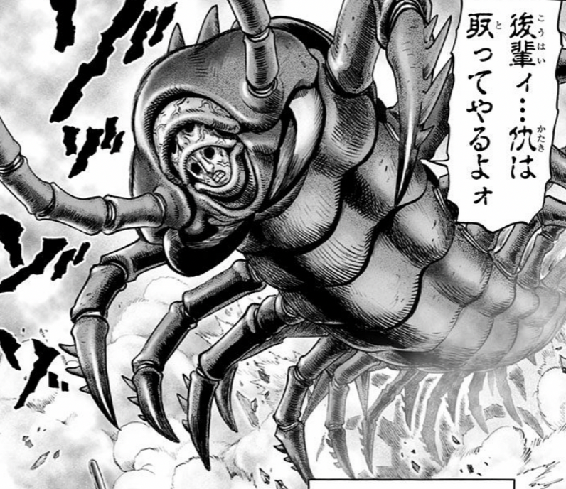 巨大なムカデの怪人。ムカデ後輩が金属バットにやられると現れ、ラフレシドンとのコンビネーションで追い詰めていくが、自分で自分を殴りつけることで催眠状態を解いた金属バットに思いきり殴りつけられ爆散した。