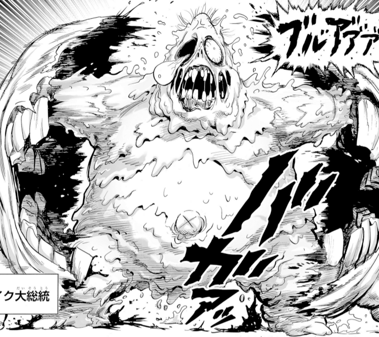 怪人協会の幹部で巨大な口だけの怪物。地上でブサイク大総統とともにバングらと交戦していると、おあずけを喰らいすぎて怒り狂って飛んできたブサイク大総統を食らっていく。が、飲み込んだブサイク大総統に内部から身体を引き裂かれ死亡した。