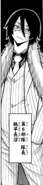 桃太郎機関華厳の滝跡地研究所第6部隊隊長。他隊長、隊員らとともに研究所に乗り込んできた無陀野と交戦。国領の能力から解放され「研究所が爆破される」という情報を聞き、早々に片を付けようとした無陀野の繚乱時雨・雨坊主で押し潰され死亡した。